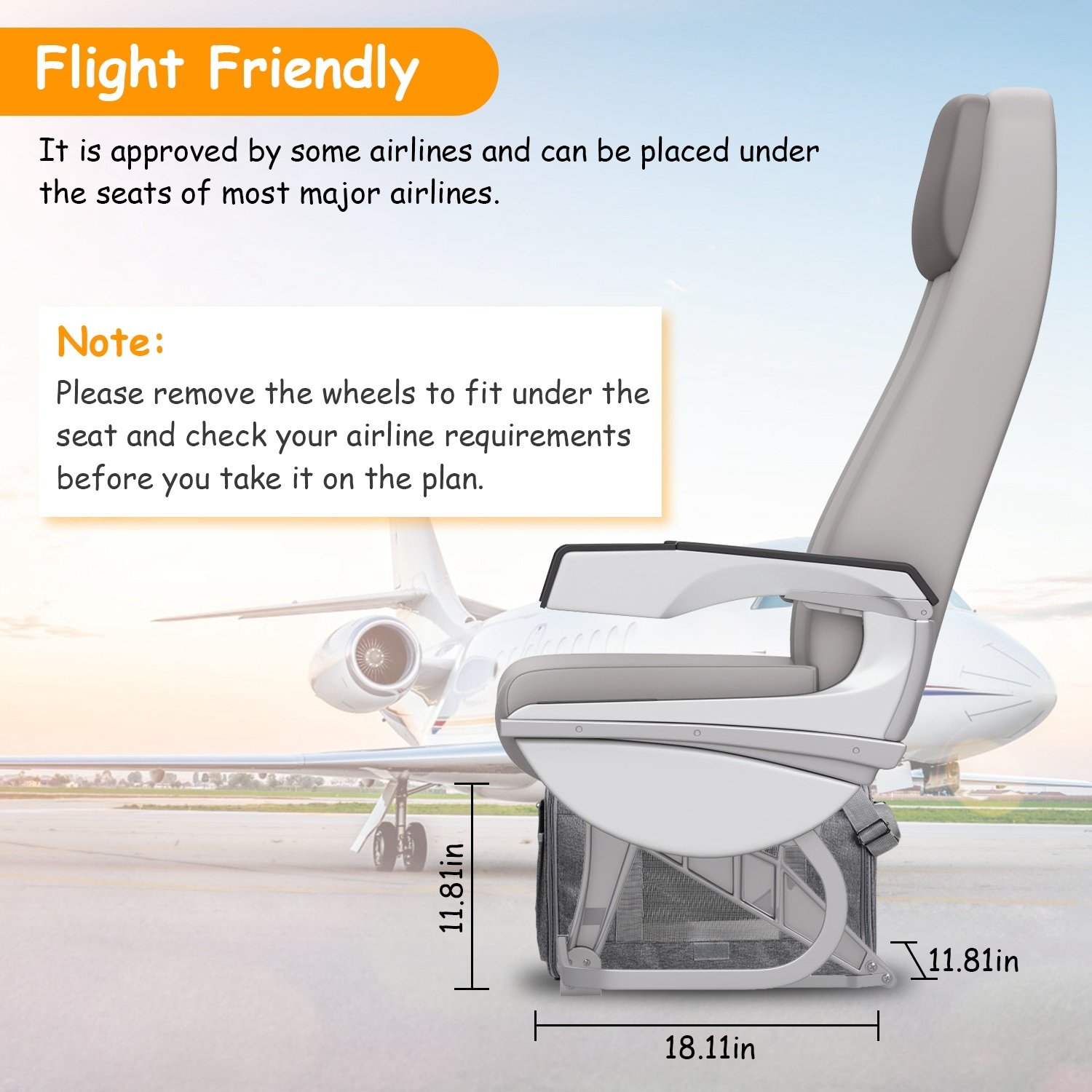 *Airline Approved*:This cat carrier fits under the seat of most airlines when the wheels are removed. It is approved by some airlines. Please check your airline requirements before you take it on the plan.
