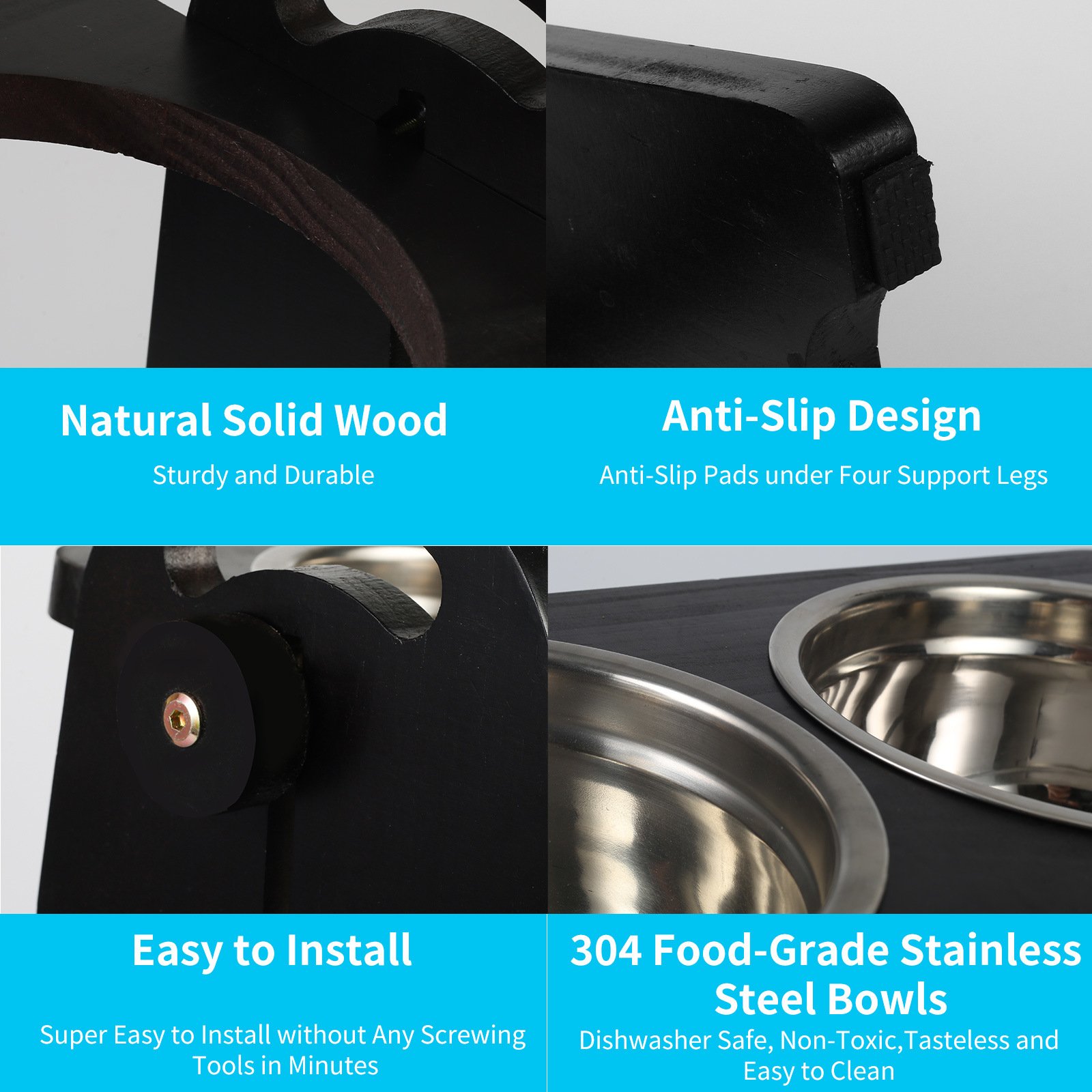 3.The Elevated Dog Bowls Stand Made by Natural Solid Wood, Sturdy and Durable, 304 Food-Grade Stainless Steel Bowls, Non-Toxic and Tasteless, Anti-Slip Pads under Each Legs to Ensure It Won’t be Tip Over by Dogs.