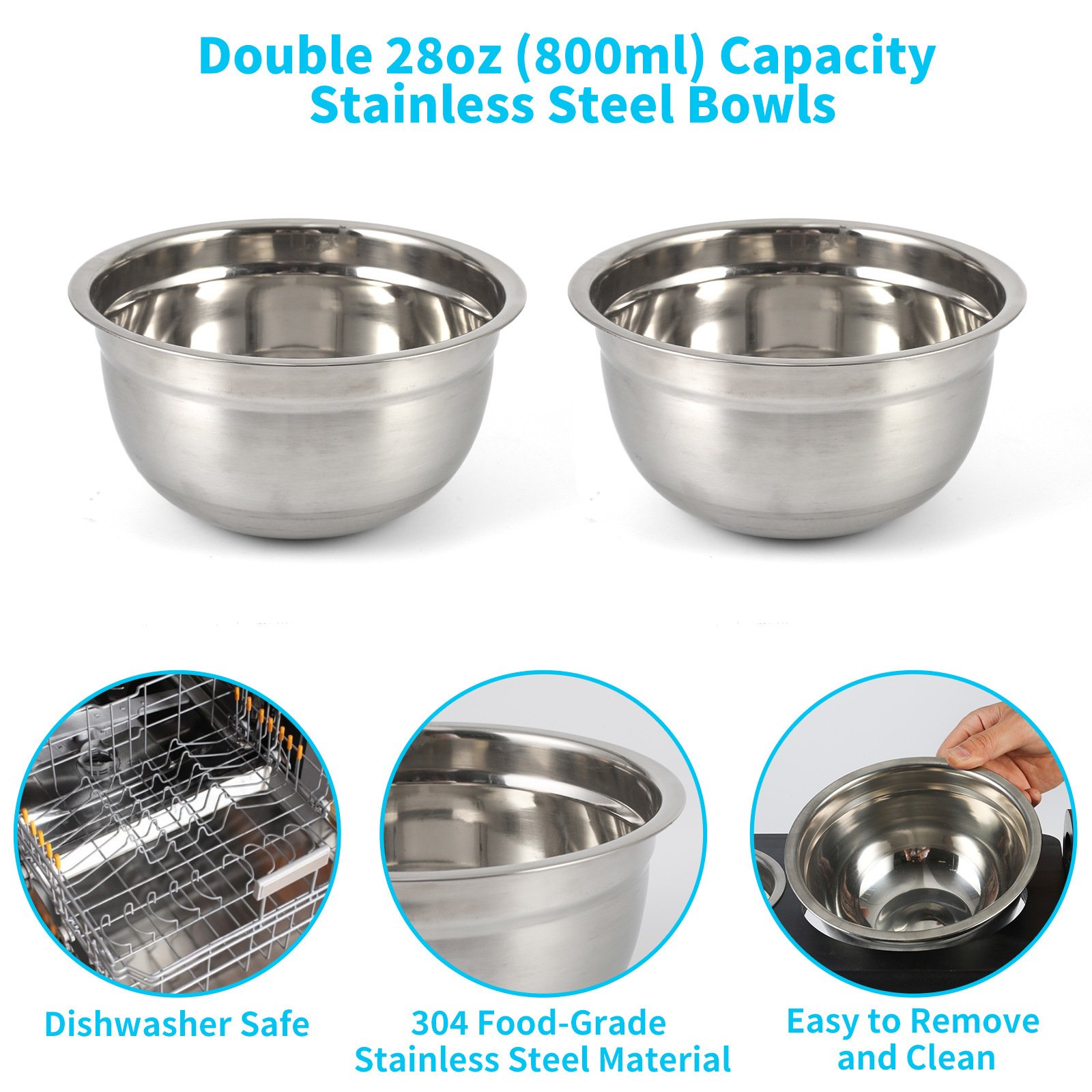 5.Double Stainless Steel Food and Water Bowls Can be Taken out From Stand at any time for Easily Cleaning and Dishwasher Safe, The Solid Wood Surface won’t get Mouldy Even It gets Wet by Food or Water.
