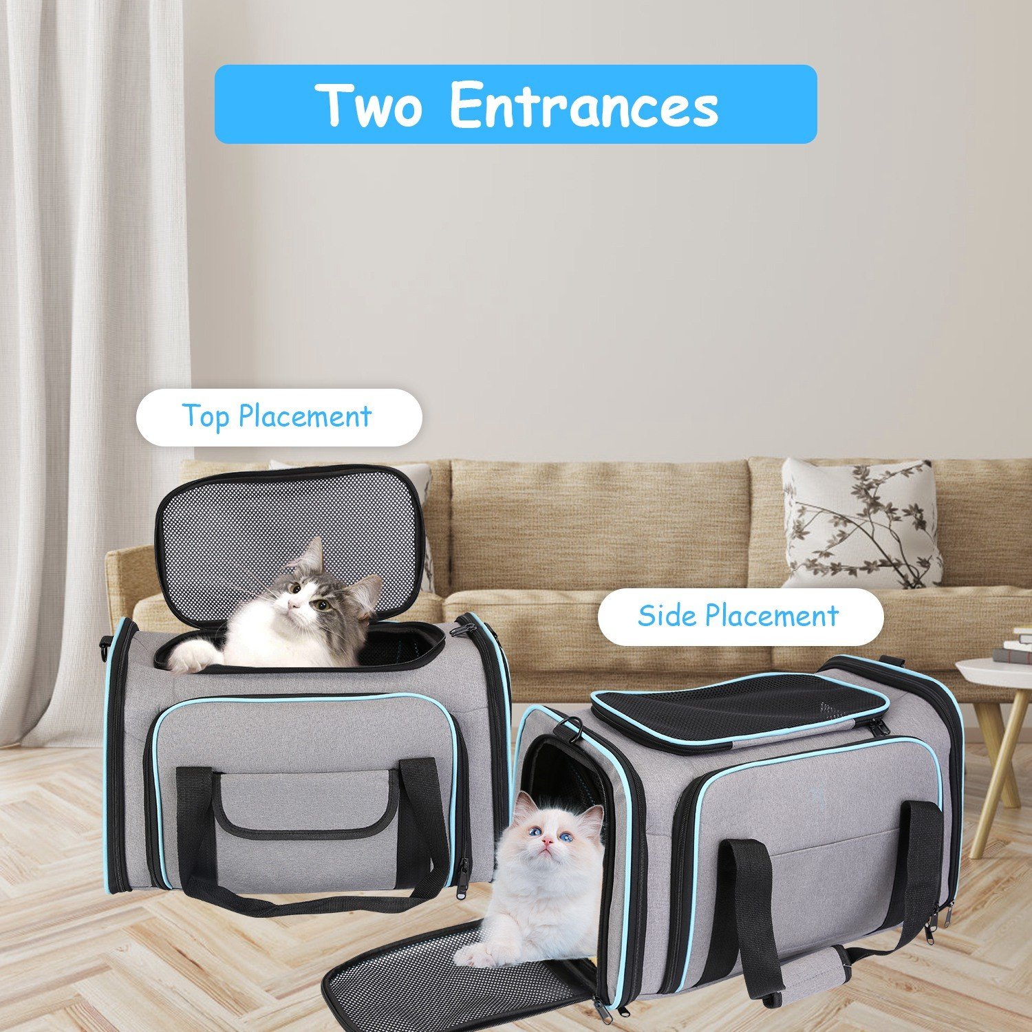*Multifunctional Pet Carrier*:This is a multifunctional pet carrier,which can be used as a handbag,shoulder bag with portable handle straps and a length-adjustable shoulder strap,which is perfect for taking your pet to travel. After extended,it provides more space with two side expanded mesh shelter and the soft sleeping pad allows your cat to sleep and play comfortably,which is ideal for camping/ picnics.