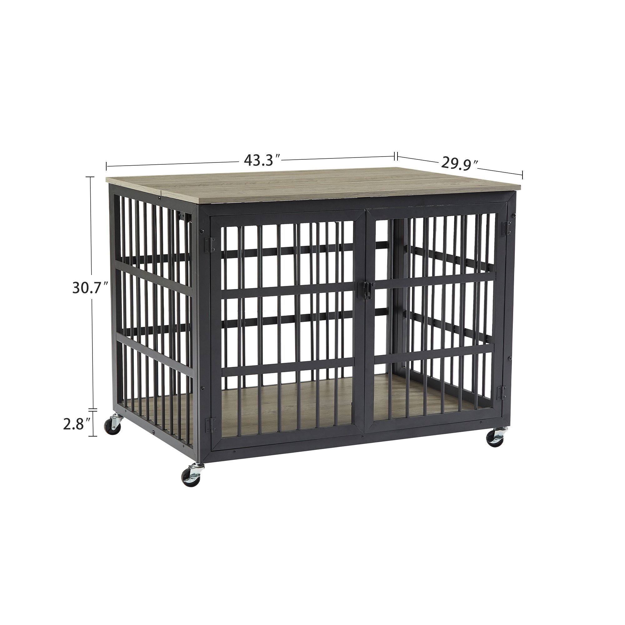 Product NameFurniture style dog crate wrought iron frame door with side openings, Grey, 43.3''W x 29.9''D x 33.5''H.