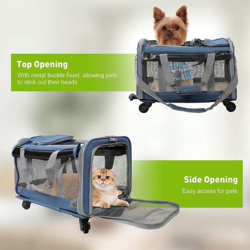 This pet rolling carrier can pull rod, car load, hand carry.
