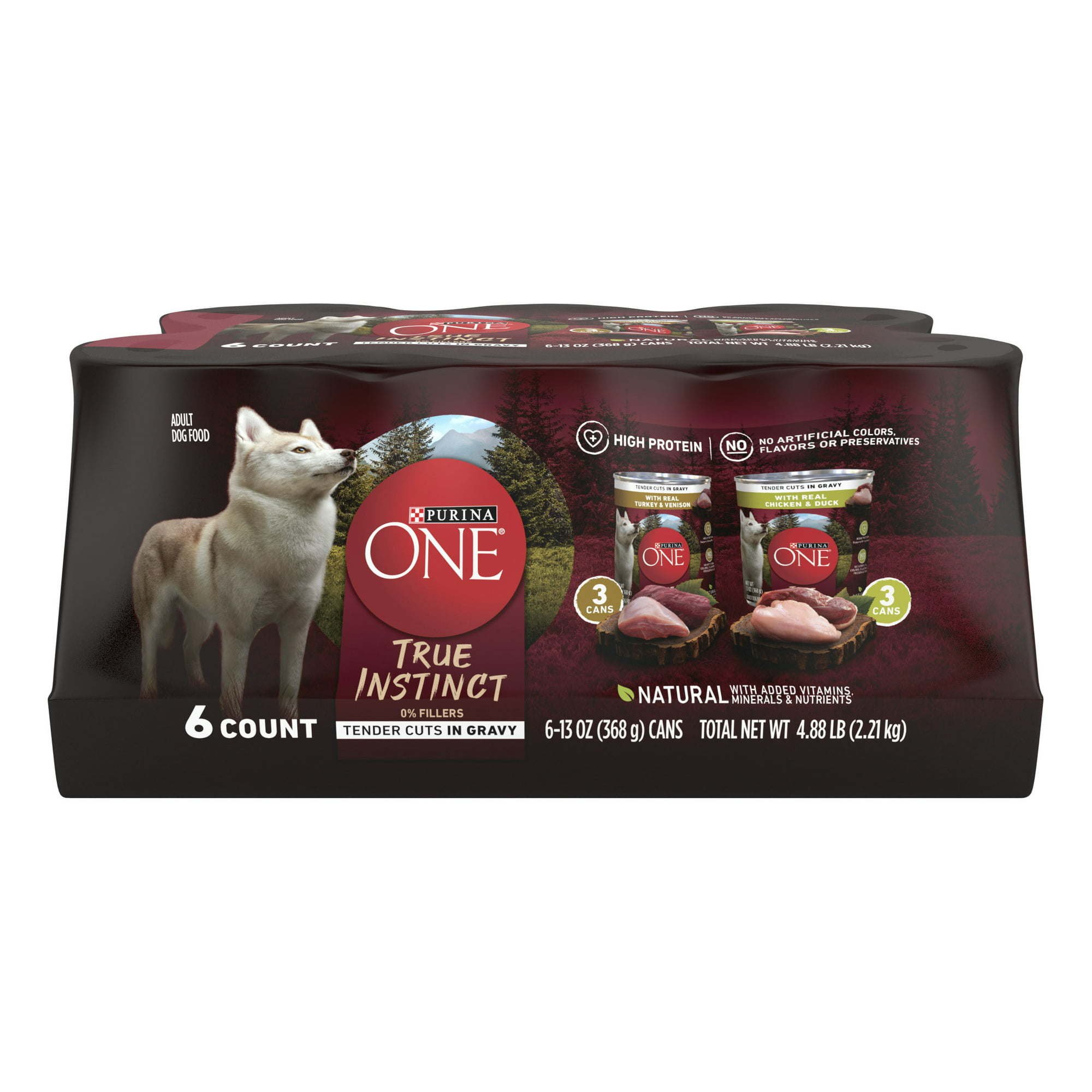 Purina One True Instinct Wet Dog Food Variety Pack High Protein, Serve up an assortment of options during your dog's mealtimes with this Purina ONE Natural True Instinct Tender Cuts in Gravy adult wet dog food variety pack with added vitamins, minerals and nutrients. Both of the recipes feature real poultry along with other high-quality ingredients you can feel good about giving to your canine companion. The tender, meaty texture gives your dog something to sink his teeth into, and a rich dog gravy balances out each of these delicious meals for added flavor and moisture. With 100 percent complete and balanced nutrition for your adult dog's lifelong whole-body health, this canned food for dogs is convenient way to satisfy his nutritional needs.